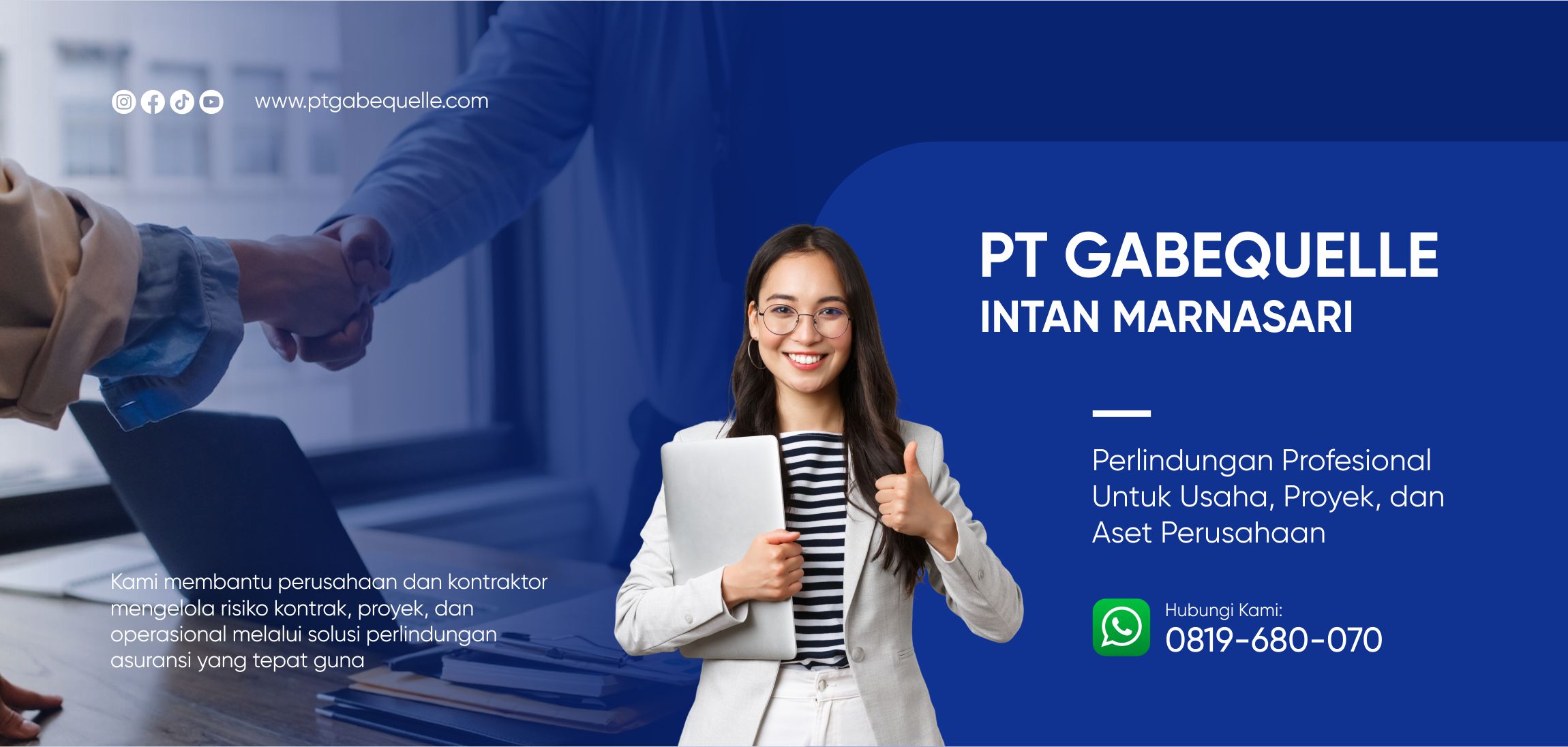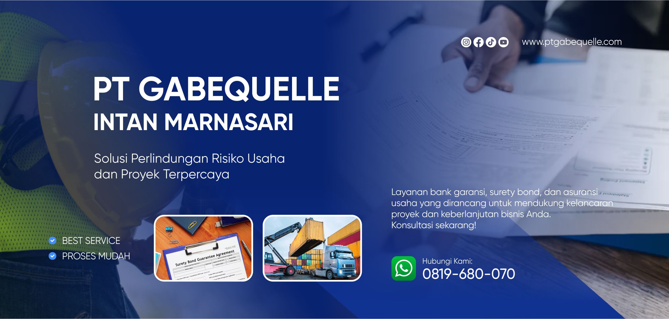 PT Gabequelle Intan Marnasari merupakan perusahaan yang bergerak di bidang jasa perlindungan risiko usaha dan proyek. Kami hadir untuk membantu pelaku usaha, kontraktor, dan perusahaan dalam mengelola risiko bisnis melalui solusi asuransi, bank garansi, dan surety bond yang tepat dan sesuai kebutuhan.